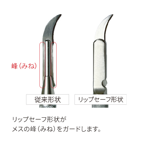 ・リップセーフの形状がメスの峰(みね)をガードし、口角や粘膜へのあたりを和らげ痛みを軽減します。