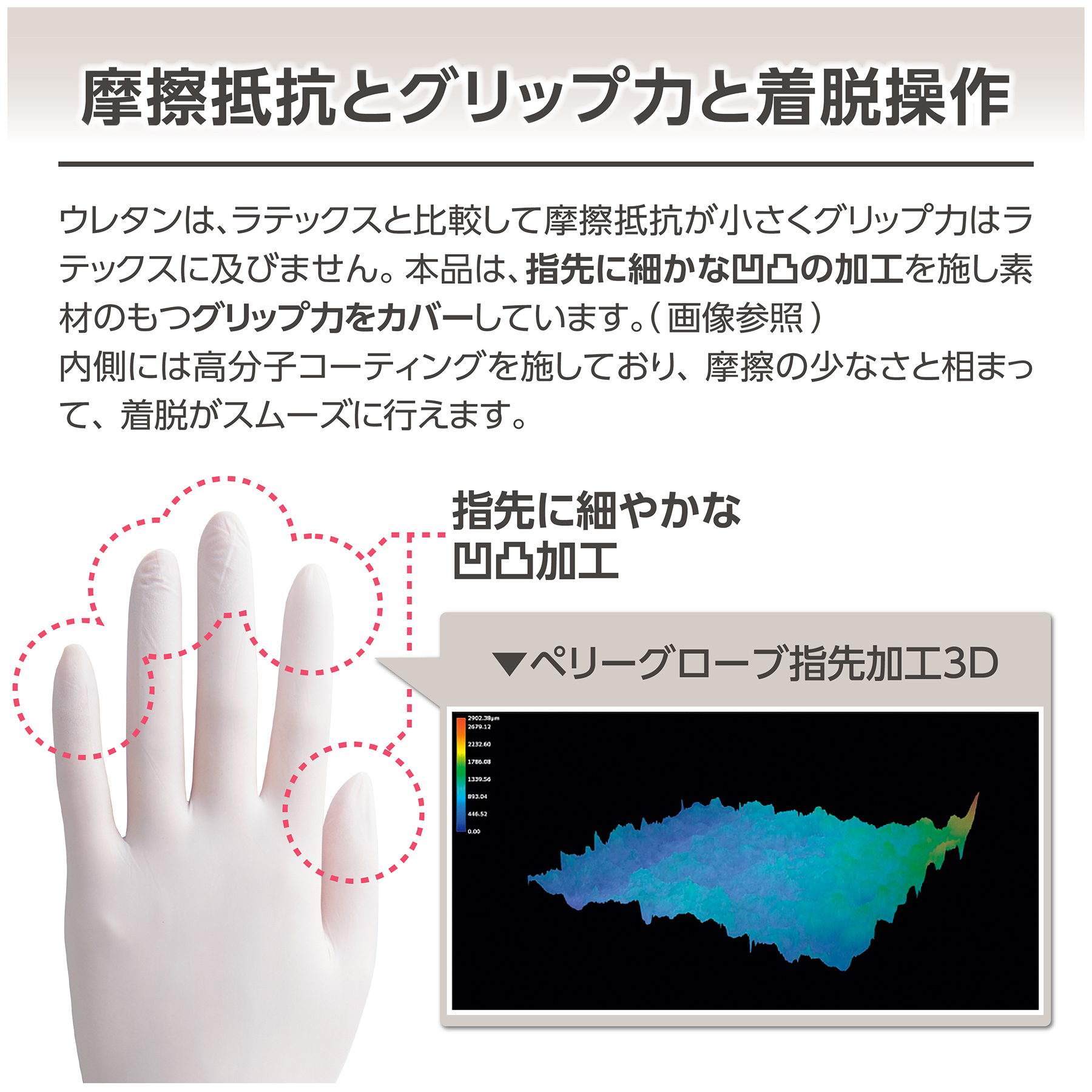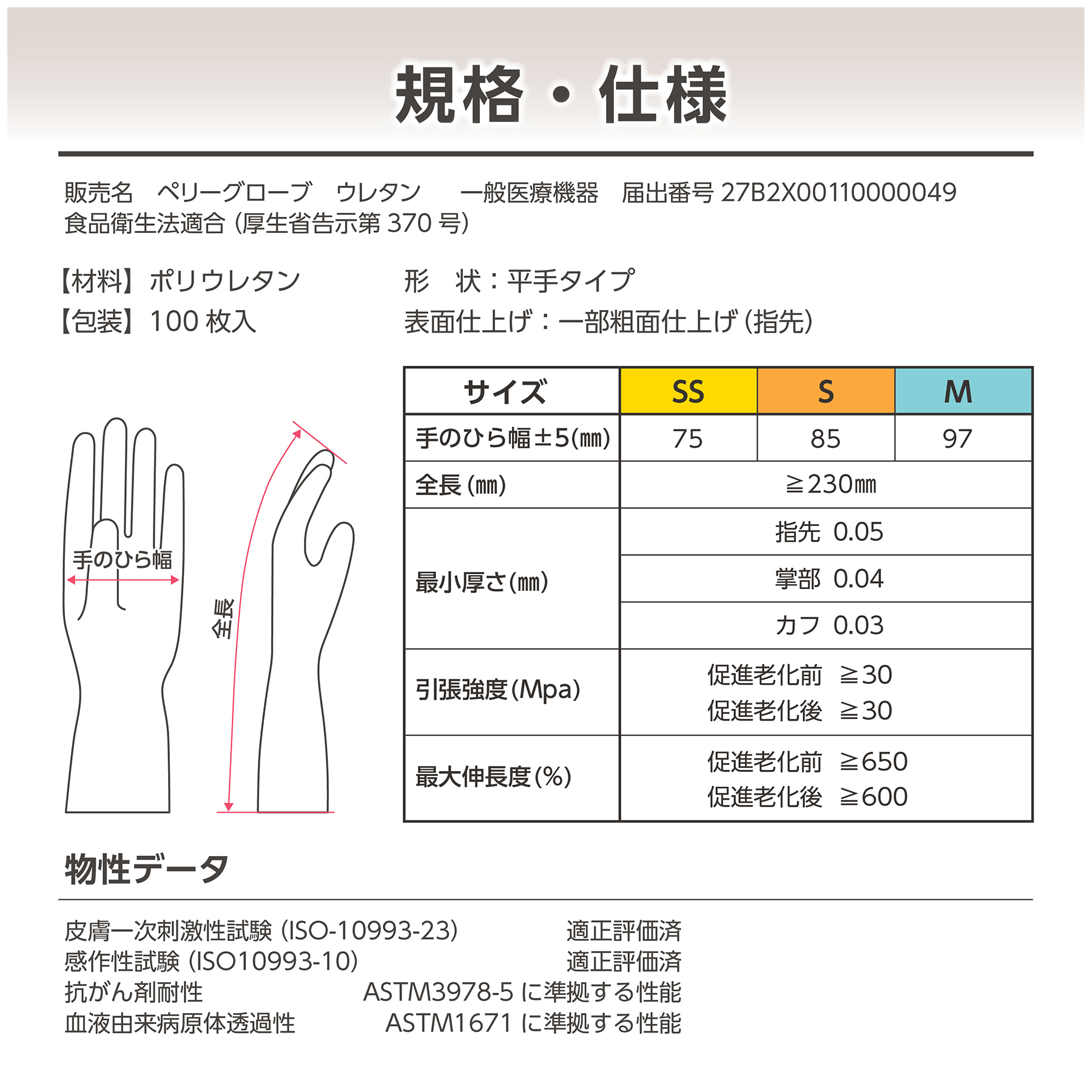 ●最小厚さ:指先0.05mm、掌部0.04mm、カフ0.03mm
