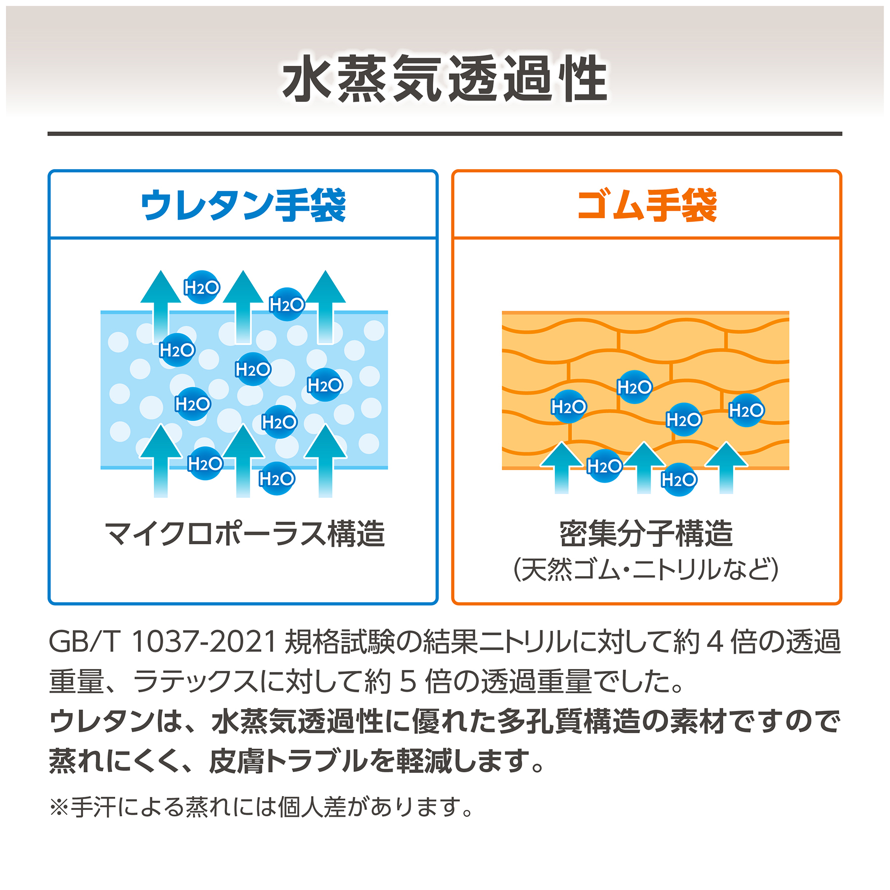 他素材と比較し数倍の水蒸気透過性は、敏感な肌の方にもやさしくフィットし、着用による皮膚トラブルを軽減します。
