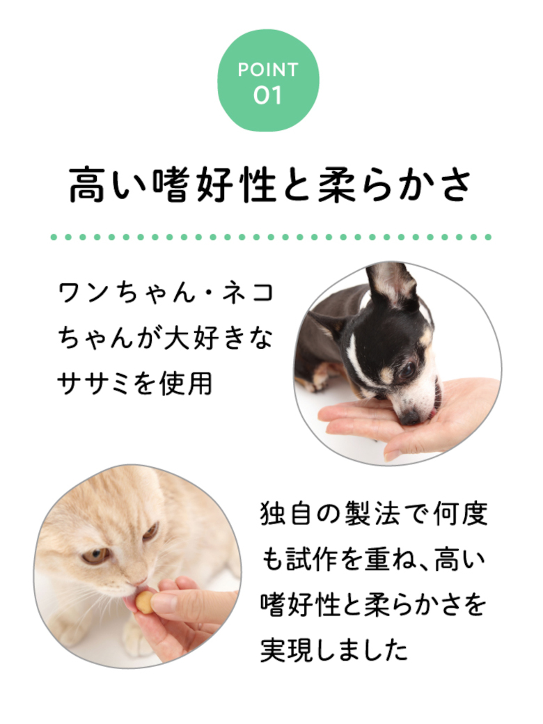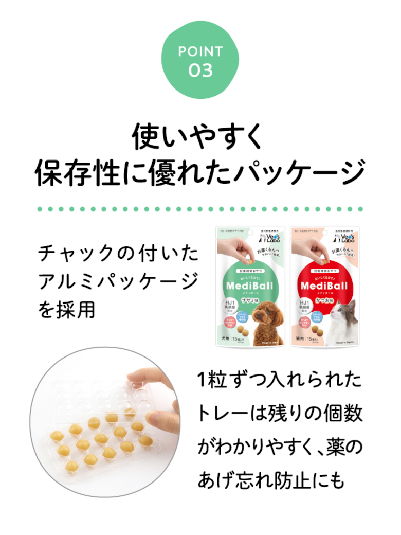 メディボールの匂いや苦みを感じさせない高い嗜好性と柔らかさは、犬・猫が大好きなササミを主原料とし、ササミパウダーを練り上げて作られた独自の製法。