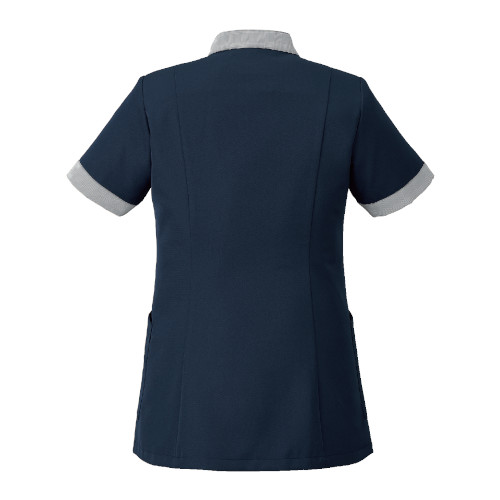 ●アシンメトリーな立ち襟やグレンチェックの配色が知的で上質感のあるネイビーに映えるジャケットです。