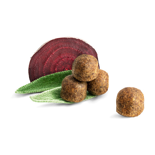 ●原材料:グリーブス(脱脂ハラミ肉19%)、ポルトリープロテイン**、コーン、コーン粉、牛脂、米粉、ポテトフレーク、ミートミール*(ビーフ、ポーク)、ひまわり油(2.4%)、リグノセルロース、ヘモグロビン*、加水分解フィッシュ*、ビートファイバー*、菜種油(0.6%)、全卵パウダー、塩化カリウム、サッカロマイセスセレビシエ*、アップルポマス*(0.4%)、塩化ナトリウム、キャロット*(0.25%)、海藻*、亜麻仁(0.16%)、ハーブミックス(ミルクシスル、アーティチョーク、タンポポ、ショウガ、カンバ葉、ネトル、カモミール、コリアンダー、ローズマリー、セージ(0.013%)、リコリス根、タイム 計0.16%)、チコリパウダー(0.15%)、えんどう豆フレーク(0.13%)、ビーツパウダー(0.13%)、緑イ貝*(0.05%)、イースト抽出物*(0.02%)、ビタミン類(ビタミンA、ビタミンD3、ビタミンE、ビタミンB1、ビタミンB2、ビタミンB6、ビオチン、Dパントテン酸カルシウム、ナイアシン、ビタミンB12、ビタミンC)、ミネラル類(鉄、銅、亜鉛、マンガン、ヨウ素酸カルシウム、亜セレン酸ナトリウム)その他栄養素(DLメチオニン、タウリン、コリン)、天然由来トコフェロール(酸化防止剤として)(*乾燥)(**乾燥一部加水分解)※合成保存料無添加です