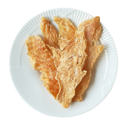 ささみを一度たたいて薄くし、食べやすいサクサクした食感に仕上げたジャーキー。手で簡単に小さくちぎれる硬さ。