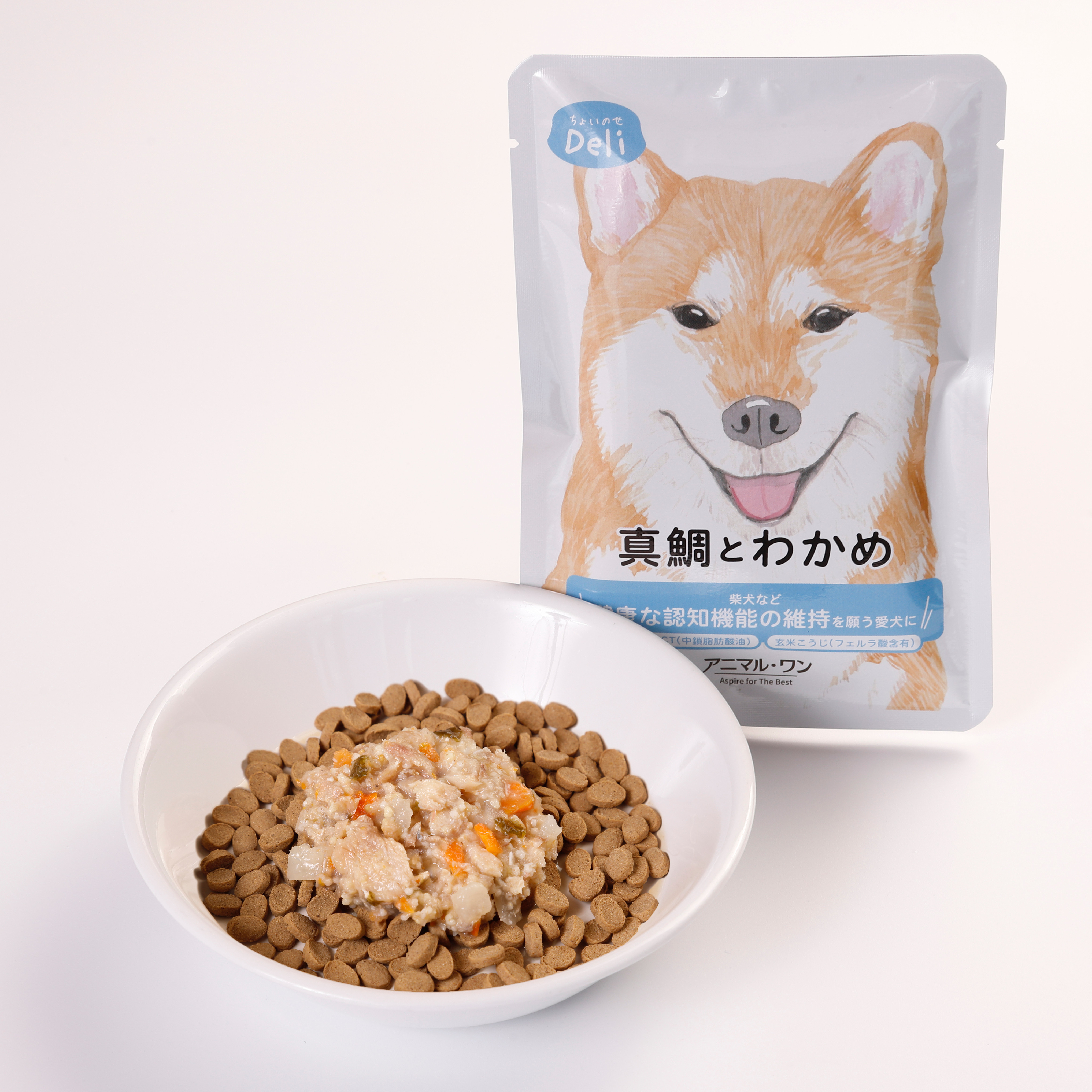 ●真鯛とわかめ:真鯛、にんじん、だいこん、あわ、きび、玄米こうじ(フェルラ酸含有)、ほたてだし、DHA含有精製魚油粉末、米油、MCT(中鎖脂肪酸油)、寒天、こんにゃく粉、わかめ、カツオブシエキス