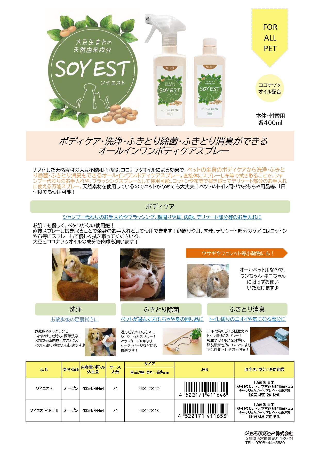 ●ナノ化した大豆不飽和脂肪酸とココナッツから抽出したココナッツオイルによる天然成分のオールペット用ボディケアスプレーです。