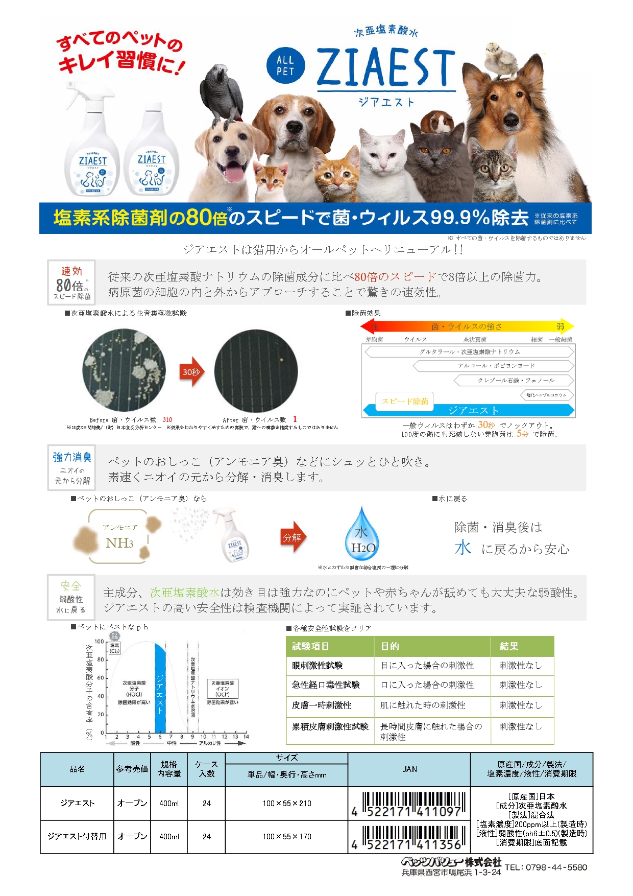 ●従来の塩素系除菌剤に比べて、80倍のスピードで菌・ウイルスを99.9%除去できるオールペット用の除菌・消臭剤の付替用。