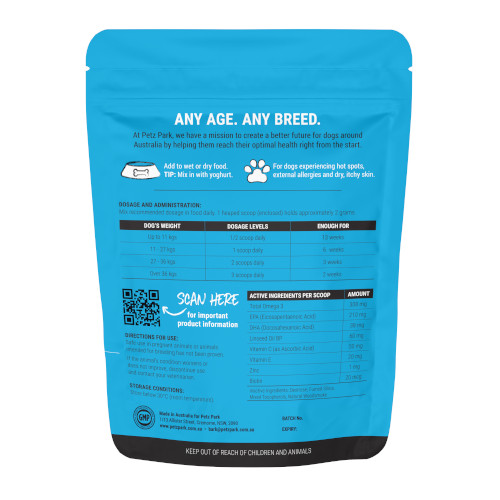 ●皮膚と被毛の健康維持のため設計された犬用のサプリメントです。オメガ3配合で、愛犬の美しい皮膚や毛並みをサポートします。