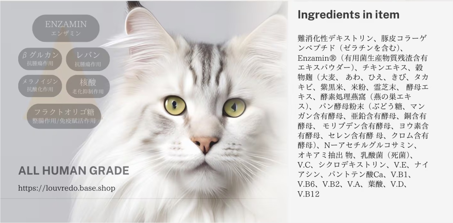 難消化性デキストリン、豚皮コラーゲンペプチド(ゼラチンを含む)、EnzaminR(有用菌生産物質残渣含有エキスパウダー)、チキンエキス、穀物麹(大麦、あわ、ひえ、きび、タカキビ、紫黒米、米粉、霊芝末、酵母エキス、酵素処理燕窩(燕の巣エキス)、パン酵母粉末(ぶどう糖、マンガン含有酵母、亜鉛含有酵母、銅含有酵母、モリブデン含有酵母、ヨウ素含有酵母、セレン含有酵母、クロム含有酵母)、Nーアセチルグルコサミン、オキアミ抽出物、乳酸菌(死菌)、V.C、シクロデキストリン、V.E、ナイアシン、パントテン酸Ca、V.B1、V.B6、V.B2、V.A、葉酸、V.D、V.B12
