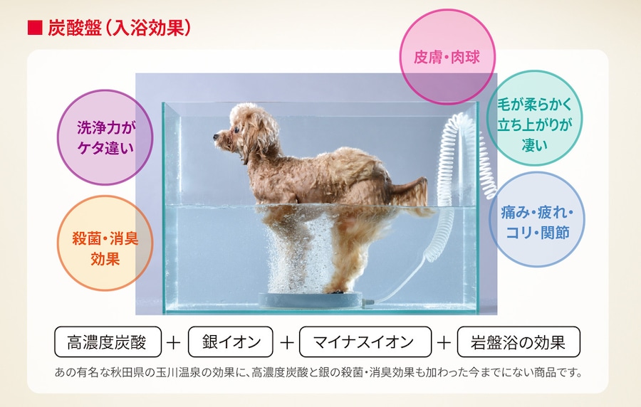 ペット浴として大活躍。炭酸浴で皮膚炎や痒み・フケなどの予防にも効果的です。