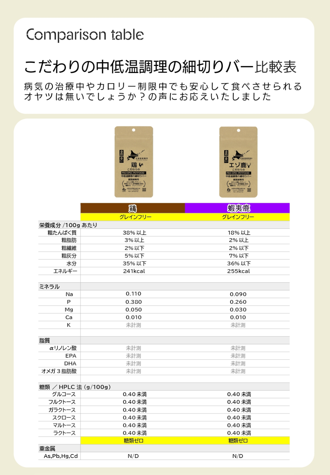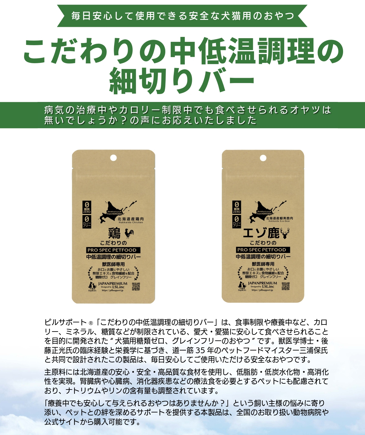 ●北海道産の鶏肉とエゾ鹿肉を使用し、90℃以下の低温調理で素材本来の旨味と栄養をしっかりキープ。高タンパク・低脂肪・低炭水化物の設計で、心臓・腎臓・消化器の健康に配慮しながら、療法食との併用にも対応しています。