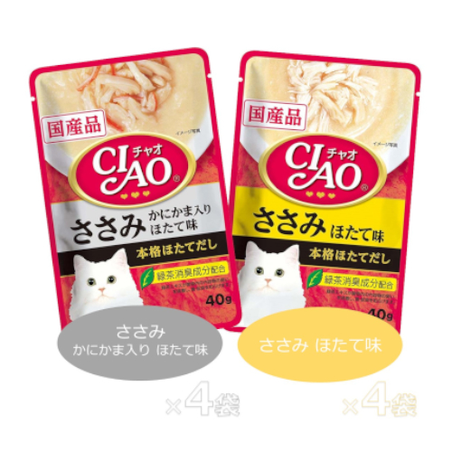 鶏肉(ささみ)、かに風味かまぼこ、ほたてエキス、糖類(オリゴ糖等)、植物性油脂、増粘安定剤(加工でん粉、増粘多糖類)、ミネラル類(Na、P、Cl)、調味料(アミノ酸)、ビタミンE、紅麹色素、緑茶エキス