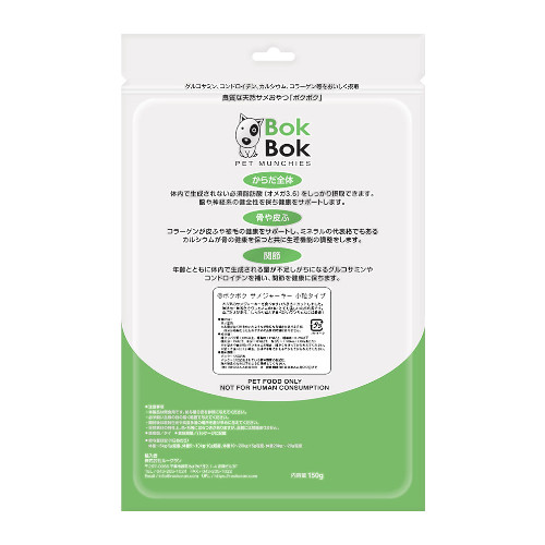 BokBok(ボクボク)は、インド太平洋熱帯・亜熱帯域全域の沿岸に広く生息する「blacktip shark(日本名:ツマグロ)」というサメ種を主原材料に使用した、タイランド産の犬用サメおやつです。無添加・無着色のハードタイプおやつをひとくちサイズにカットしてあります。高タンパクで旨みがたっぷり!お肉大好きというワンちゃんにおすすめです。楽しく噛んで栄養を摂取しましょう。