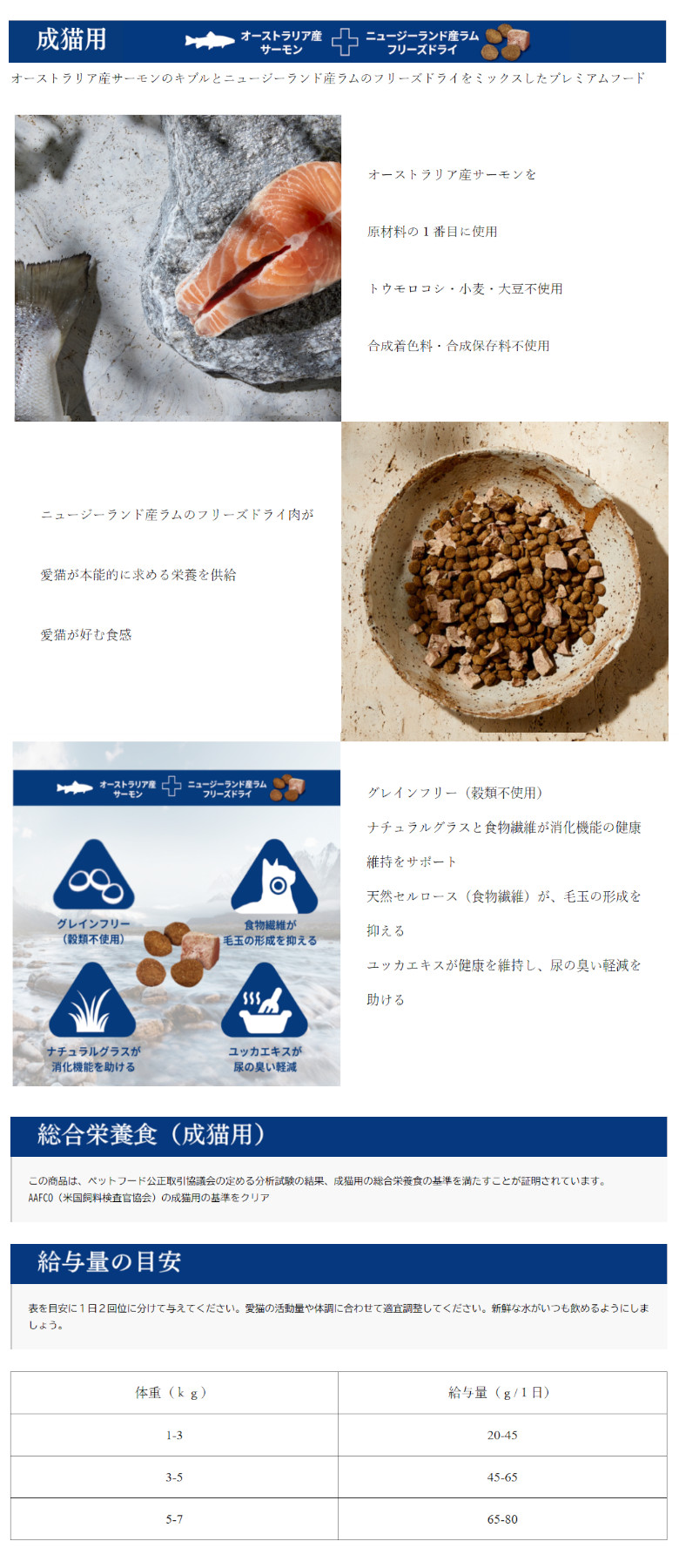 ●サーモン サーモンミール フィッシュミール エンドウ豆プロテイン エンドウ豆 レンズ豆 動物性油脂 フリーズドライラム タピオカデンプン ビーフ&フィッシュエキス ビートパルプ セルロース アルファルファ チコリ ユッカエキス ビタミン類 A B1 B2 B6 B12 D3 E K コリン ビオチン パントテン酸 葉酸 ナイアシン ミネラル類:ナトリウム カリウム 銅 カルシウム 鉄 マンガン セレン 亜鉛 アミノ酸類:タウリン メチオニン 酸化防止剤:クエン酸 ミックストコフェロール ローズマリーエキス