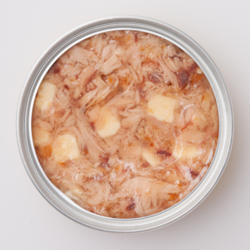 ●高たんぱくでカルシウムの多いチーズとビタミン類が豊富な花かつおをまぐろの高級白肉にブレンドしました。