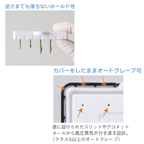 ・ひっくり返してもバーが落ちないホールド性。滅菌中やチェアサイドでバーを紛失しない。